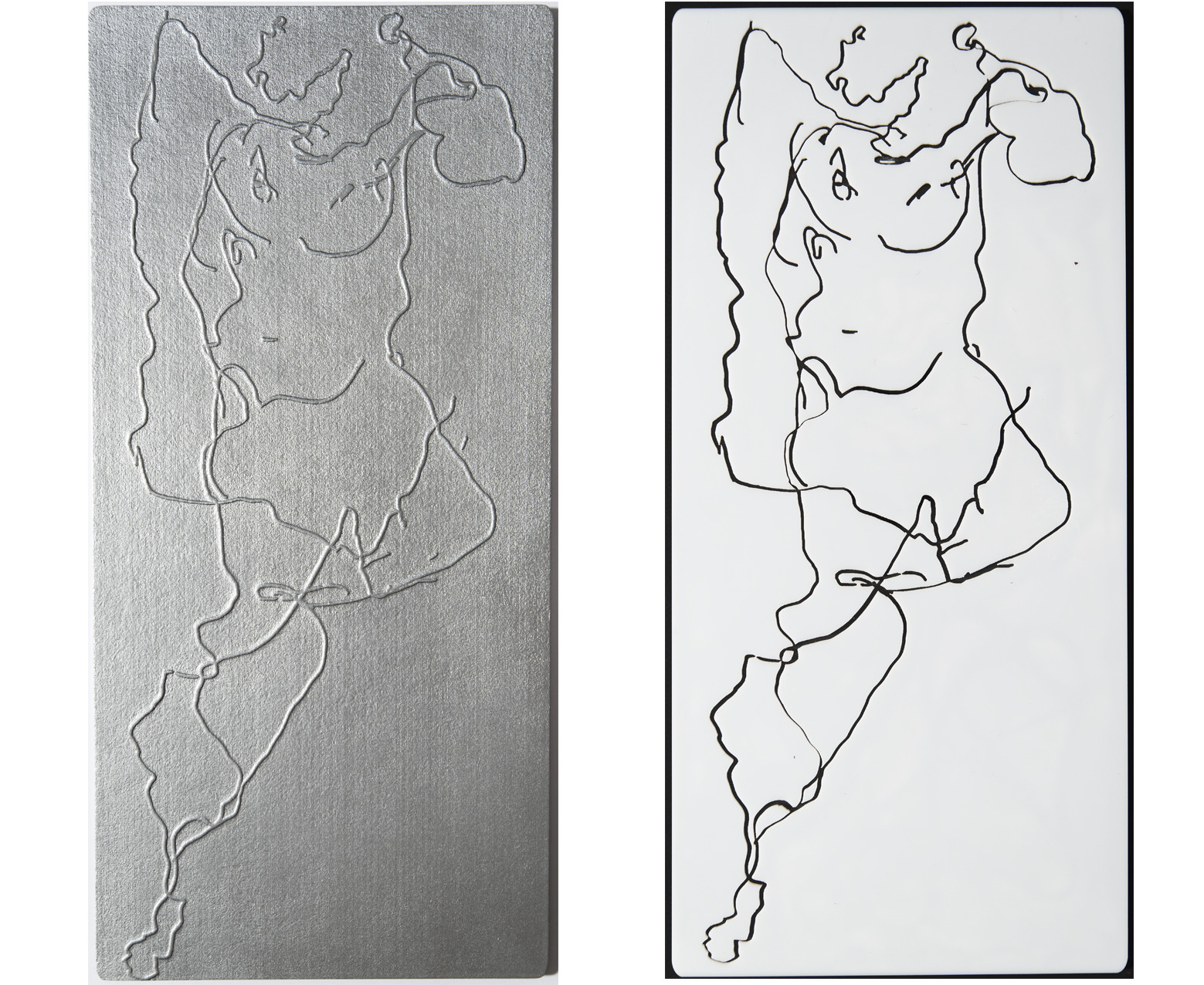 Critère 5, EFFLEURER : à gauche : découpe en relief sur médium argenté
